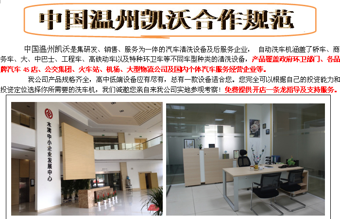 瑞安凱沃公司洗車設(shè)備從研發(fā)到生產(chǎn),直接到客戶手中,沒有中間商環(huán)節(jié),價格更加實惠,還會得到更好的保修服務(wù)。 我們首家推出:買洗車設(shè)備就可獲得從籌備到開業(yè)的全方位支持。不僅省心省力,同等規(guī)模的經(jīng)營項目更比加盟別人品牌節(jié)約投資30%以上,因為我們設(shè)備都是廠家直銷價,還可以從我們這里得到經(jīng)營、管理、培訓(xùn)、原料配給、技術(shù)支持等全方位的免費(fèi)增值服務(wù);更沒有所謂的加盟費(fèi)、保證金和品牌使用費(fèi)。市面上也有一些加盟企業(yè)對外宣稱免收加盟金、保證金和品牌使用費(fèi),卻變相的把產(chǎn)品價格翻了幾倍,照樣賺翻加盟商的錢,最后發(fā)覺上當(dāng)受騙還得不到什么實際的支持,任加盟商在大浪淘沙般的市場中自生自滅。