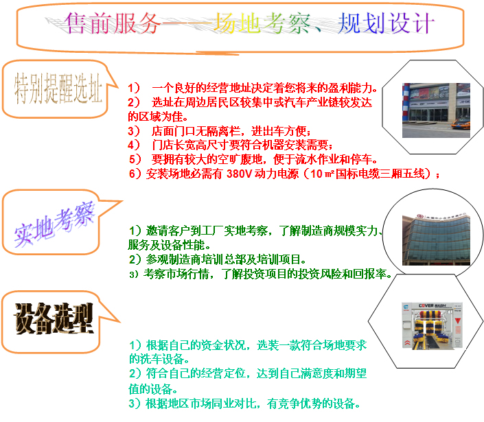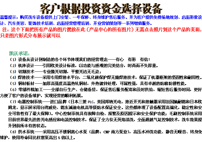 我公司產(chǎn)品規(guī)格齊全,高中低端設(shè)備應(yīng)有盡有,總有一-款設(shè)備適合您免費(fèi)費(fèi)提供開店一 條龍指導(dǎo)及支持服務(wù)。投資定位選擇你所需需要的洗車機(jī)。我們誠邀您親自來我公司實地參觀考察!