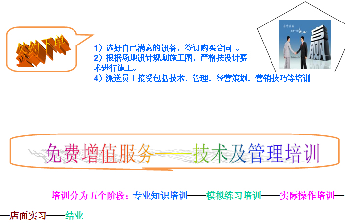 我公司為客商提供支持具體如:選址、管理、技術(shù)、培訓(xùn)、信息、經(jīng)營策劃、配送、 服務(wù)等共八項支持: